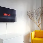 Homefy Design Apartment, In Toplage, Mit Netflix consta de una zona de estar con un sofá y un escritorio, y comodidades modernas como TV y televisión con múltiples canales. Este apartamento dispone de 1 baño con un inodoro separado de la ducha, una bañera y una ducha. También ofrece artículos de tocador para huéspedes.